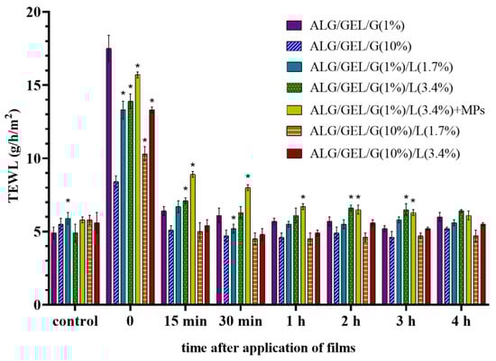 Skin barrier quality (transepidermal water loss—TEWL) after application of films based on sodium alginate and gelatin with different amounts of glycerol and lipids, as well as the sample with incorporated PLA microparticles. The control measurements were performed before the application of materials to the skin, whereas time = 0 refers to the tests taken immediately after removal of the films that had been applied to the skin for 10 min. Significant differences compared to the control samples: ALG/GEL/G (1%) and ALG/GEL/G (10%) for each time were marked on the graphs with (*).