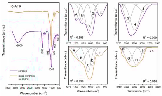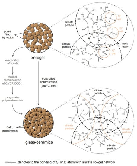 Finally, we analyzed the broad band recorded in a frequency region from 3750 up to 2500 cm−1. The deconvolution revealed the presence of three bands originated from different types of OH moieties: Geminal or vicinal Si–OH groups (~3630 cm−1, band F), hydrogen-bonded Si–OH groups (~3450 cm−1, band G), and hydrogen-bonded OH groups originated from residual water and organic compounds (~3200 cm−1, band H). It should be noted that deconvolution also revealed the fourth component band (~2990 cm−1, band I), which corresponded to the vibrations of C–H bonds [53,54,56]. It was observed that an indicated broad band was much more intense for xerogels than for glass-ceramics (indeed, to show the deconvolution better, the band’s intensity was fivefold enlarged). In fact, such a relatively strong band for xerogels was a consequence of “trapping” of water and organic liquids inside pores via hydrogen-bonding created with unreacted Si–OH groups. During ceramization, the band was significantly reduced, which clearly evidenced successful evaporation of water and organic liquids as well as a continuation of polycondensation reaction. The conclusions from the above observations could also be confirmed by the behavior of the infrared signal located at ~1660 cm−1, which was attributed to the vibrations of the C=O bond, Si–OH surface groups, and adsorbed water [55,57,58]. The indicated band was well-observable for xerogels, and it almost completely disappeared for glass-ceramics. According to IR and XRD results, the graphical visualization of sol-gel evolution during performed ceramization at 350 °C, as presented in Figure 3.