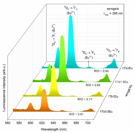 The emission spectra recorded for fabricated XG1TbxEu xerogels using λexc = 395 nm excitation line were shown in Figure 4. The characteristic 5D0 → 7FJ luminescence bands of Eu3+ ions were detected in the reddish-orange light area and their maxima were located at following wavelengths: 578 (J = 0), 592 (J = 1), 615 (J = 2), 647 (J = 3), and 698 nm (J = 4). A gradual increase in their intensity was observed, when the Tb3+:Eu3+ molar ratio systematically changed from 1:0.5 to 1:2. It is clearly visible that among series of recorded bands, the 5D0 → 7F2 one was the most prominent line for all xerogels before their controlled ceramization, despite the Tb3+:Eu3+ molar ratio. Indeed, Eu3+ ions were frequently used as spectral probes due to the characteristic nature of their transitions. The 5D0 → 7F1 is a magnetic-dipole transition (MD) in nature, the intensity of which is rather independent of the host. In contrast, the 5D0 → 7F0.2–4 are electric-dipole transitions (ED) known to be forbidden by the Laporte selection rule and may occur due to mixing the 4f orbitals with the opposite parity at the low-symmetry sites. Among ED transitions, the 5D0 → 7F2 one has a hypersensitive nature, and its intensity is easily affected by the local vicinity: It is promoted in low-symmetric frameworks; meanwhile, it is inhibited in more symmetric environments. Hence, we could infer about the symmetry based on the ratio of integrated intensities of the bands mentioned above, which is well-known in literature as the R/O ratio (I(5D0 → 7F2)/I(5D0 → 7F1)) [59,60]. XRD results confirmed the amorphous nature of xerogels without long-range order, so we expected relatively high asymmetry in the immediate vicinity of Eu3+. Indeed, the calculated R/O ratio values hesitated from 3.50 (XG1Tb2Eu) to 3.91 (XG1Tb0.5Eu). On this occasion, it should also be noted that comparability in calculated R/O ratio values clearly pointed to a chemically similar environment of Eu3+ ions in all synthesized xerogels.
