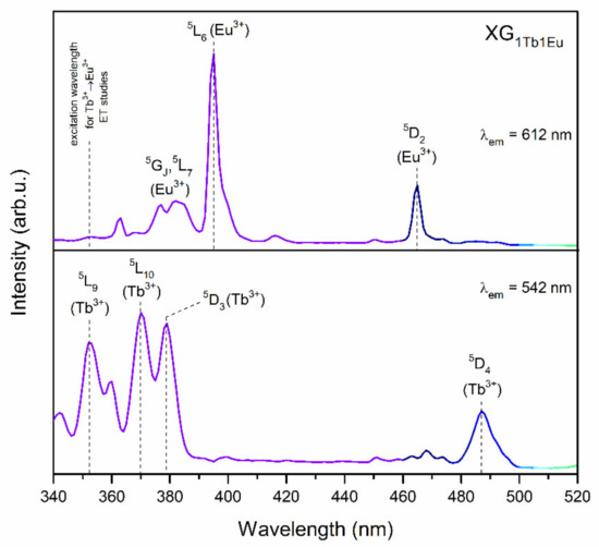 To select the excitation line appropriate for Tb3+/Eu3+ ET studies, the photoluminescence excitation spectra for XG1Tb1Eu co-doped representative xerogel were presented in Figure 6. The spectra were recorded for λem = 543 and λem = 612 nm emissions of Tb3+ (the 5D4 → 7F5 green line), and Eu3+ (the 5D0 → 7F2 red line), respectively. The recorded excitation bands of Tb3+ ions were associated to the following f-f intraconfigurational transitions: 7F6 → 5L9 (352), 7F6 → 5L10 (370), 7F6 → 5D3 (379), as well as 7F6 → 5D4 (487 nm). Simultaneously, the recorded bands were ascribed to the transitions of Eu3+ ions from the 7F0 ground state into the subsequent higher energy levels: 5D4 (363), 5GJ, 5L7 (from 371 to 390), 5L6 (395), and 5D2 (465 nm). Since the 7F6 → 5L9 transition of Tb3+ ions did not coincide with any excitation peak of Eu3+, we decided to select the λexc = 351 nm excitation line to study the Tb3+/Eu3+ ET process.