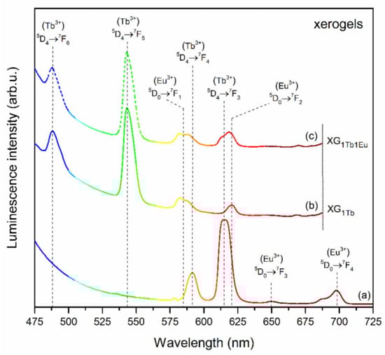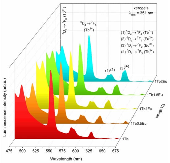The emission spectra of Tb3+/Eu3+ co-doped xerogels with the varying Tb3+:Eu3+ molar ratio recorded upon excitation at λexc = 351 nm are presented in Figure 8. A slight decrease was observed in the emission intensity of the 5D4 → 7F6 and the 5D4 → 7F5 bands of Tb3+ ions when the Tb3+:Eu3+ molar ratio gradually decreases. Hence, the R/G ratio values ((I(5D0 → 7F2)(Eu3+)+I(5D4 → 7F3)(Tb3+)/I(5D4 → 7F5)(Tb3+)) were estimated. For the XG1Tb sample, the R/G ratio was defined as the ratio of integrated intensities of the 5D4 → 7F3 red band and the 5D4 → 7F5 green emission line [63]. In the case of the XG1TbxEu co-doped samples, an additional contribution of luminescence originated from Eu3+ ions into total red emission should also be taken into account. Hence, the R/G ratio was calculated as (I(5D4 → 7F3)(Tb3+) +I(5D0 → 7F2)(Eu3+)/I(5D4 → 7F5)(Tb3+)) and its increase can be interpreted as a growing share of Eu3+ ions in total generated multicolor luminescence. Indeed, a slight increase in R/G ratio values was determined in the following order: From 0.09 (XG1Tb), through 0.15 (XG1Tb0.5Eu), 0.17 (XG1Tb1Eu), 0.26 (XG1Tb1.5Eu), to 0.30 (XG1Tb2Eu). Such an increment of the R/G ratio suggests more efficient Tb3+/Eu3+ ET when the Eu3+ content gradually grew, since the Tb3+:Eu3+ molar ratio changed from 1:0.5 to 1:2. Nevertheless, such a small increase in the R/G ratio resulted from the relatively large interionic distances between Tb3+ and Eu3+ ions, characteristic for the amorphous xerogel host.