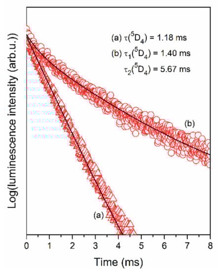 where I(t) and I0 are the luminescence intensities at time t and t = 0, respectively, while τ is the luminescence decay time [68]. Factually, in our xerogels, the rare-earths were chemically bonded with OH moieties and CF3COO− anions in complex compounds [69]. It should be noted that high vibrational energies characterize such ligands, i.e., >3000 (OH groups) and ~1200, ~1140 cm−1 (CF3COO− anions) as was demonstrated in the Structural characterization: XRD, TEM, and IR spectroscopy section (Figure 2). According to the energy gap law, the effective phonons with maximum energy located in a local surrounding of RE3+ ions (ħωmax) generate the strongest effect on decay times [70]. In this case, since OH moieties’ vibrational energy was the highest, they played a major role in the non-radiative depopulation of excited states. For glass-ceramics, the decay curves were well-fitted to a second exponential decay mode, which can be expressed by the equation:
