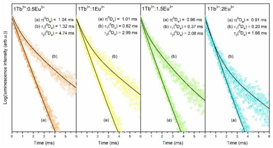 The further evaluation of Tb3+/Eu3+ ET in fabricated sol-gel materials was based on the decay analysis of the 5D4 excited state of Tb3+ ions. Firstly, the interpretation of collected data allowed us to establish a clear correlation between the decay profile (mono- or double-exponential) and type of sol-gel material (i.e., xerogel or glass-ceramic). Indeed, the curves recorded for xerogels were well-fitted to a first exponential decay mode described by the following equation: