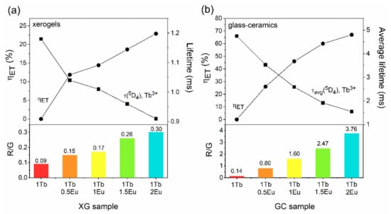 The relation between R/G ratio, energy transfer efficiency (ηET), and lifetime of the 5D4 (Tb3+) state for: xerogels (a) and glass-ceramics (b).