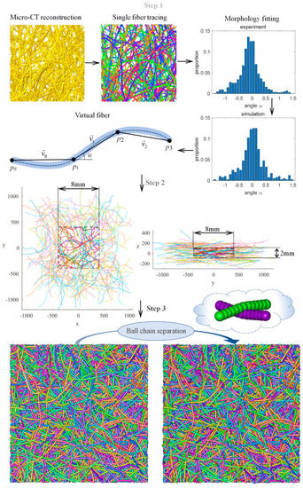 Figure 2 shows the modeling process of virtual PMFSS, which can be briefly divided into three steps: (1) single fiber generation based on statistical distribution information obtained from micro-CT images (HARRIER HP23.4JX, Metris UK Systems LTD), (2) fiber mat generation as accumulation of single fibers, and (3) non-overlapping fiber system conversion using ball chain simulation. In this work, curved spline fibers of about an 8-mm physical length are randomly orientated in the in-plane direction and obeying through-plane orientation distribution of measured experimental data. The center point of each fiber is randomly distributed in a box of a physical size of 16 × 16 × 2 mm3 (x × y × z), and the core section of a box size of 8 × 8 × 2 mm3 is then cut out as the simulation domain (Figure 2, step 2), which is later treated using ball chain simulation to separate overlapping fibers (step3). Finally, the 3D image of virtual PMFSS is generated by dilating the centerline of separate fibers with a sphere of fiber radius using Matlab (MathWorks, Natick, MA, USA). By varying the number of fibers, desired porosity can be obtained, which can be measured as the ratio of voxel numbers in the binary image accordingly. Following these steps, four models with porosities of 61%, 68%, 79%, and 90% were generated with initially 6400, 4650, 3047, and 1550 fibers laid in the 16 × 16 × 2 mm3 modeling domain. For technical details such as fiber tracing, virtual fiber mat generation, and ball chain separation, readers are suggested to view our former reports [35,36].