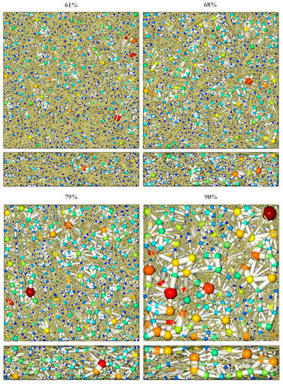 A watershed-derived pore network extraction based on open-source software “imorph” was applied [37]. Figure 3 shows the extracted pore network inside the reconstructed 3D fiber system. The spheres are shown using the jet colormap to tell the varied pore sizes from small (dark blue) to big (dark red) sizes. The more detailed distribution data is demonstrated in Section 3.1. It can be seen that the void space of virtual PMFSS was successfully divided into individual spherical pore cells connected by cylindrical throats. Note that the pore cell is rendered using a 3D ball of center point with the local maximal distance value. Similar treatment is applied to the throat, where two neighboring pore cells are connected with a cylinder of centerline connecting the center points of the two-neighboring ball-representing pore cells. The cylinder is rendered with a radius equal to the maximal distance value at the interface between the two neighboring pore cells. On closer observation, especially at 90% porosity, it can be seen that some throats are penetrated by fibers. It happens since the flow paths are tortuously expanded to avoid fibers rather than straightness, as assumed in PNM.