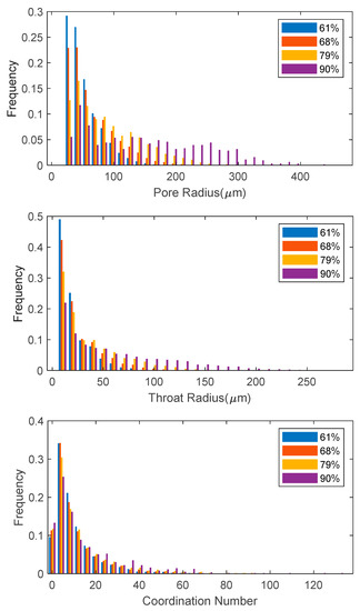 Distributions of pore radius, throat radius, and coordination number in 61%, 68%, 79%, and 90% porosity PMFSS.