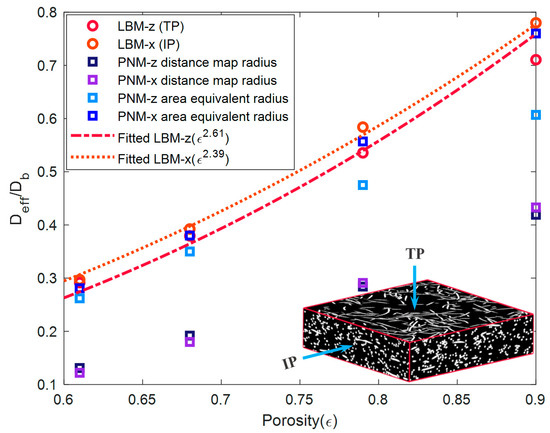 where m is the Bruggeman exponent [17]. Note that the default value of m is 1.5, which is used to predict the diffusivity of porous material composed of uniformly distributed spheres. The fitted m value equals 2.39 in the IP direction and 2.61 in the TP direction in our work, respectively, which is in a range of available literature [19,39] (between 2 and 3). The fitted value in Reference [13] is larger (m = 3.8 for the TP direction). The bonders are added in the fibrous network in Reference [13], which might increase the tortuosity of the flow domain. The Bruggeman approximation is also widely applied in another form below.