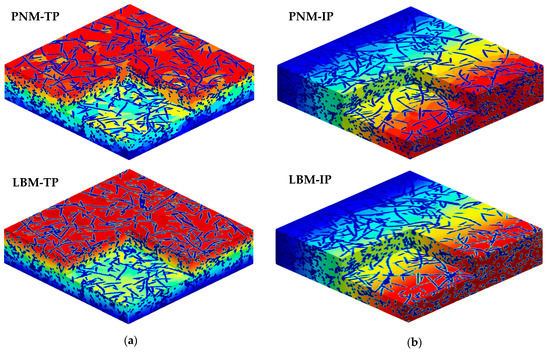 Relative to PNM, LBM takes a full account of the impact of the microstructure on the transport properties. Even though it is more time consuming, it can provide reliable results, and, thus, taken as the benchmark against which a parametric study of PNM is judged. Figure 6 shows the results of both the IP (x-direction) and TP (z-direction) directions. The direction of the x-axis is chosen without loss of generality since the fibers align isotropically in the material plane. In the extracted pore network, the throat is generated during watershed segmentation as a boundary between adjacent pores located at the chosen spots with the local maximal distance value. Therefore, the throats usually play as the narrow parts in the pore network architecture and result in the bottleneck during various mass transportations (Equation (2)). The cross-sectional shape of the throat is more complex than the inscribed circle with a radius of a local maximal distance value to characterize the throat size using the radius of the inscribed circle, which will lead to a conservative result. This problem is remedied by introducing the area-equivalent radius, i.e., a circle of area equivalent to the cross section’s radius, during the calibration of capillary pressure curves between the PNM result and the experiment measurement [31]. The mean value of an area-equivalent radius is about three times as much as the mean value of the distance map radius. In this work, the area-equivalent radius is also verified to be efficient for a diffusion calculation. A better agreement is achieved between PNM and LBM when the area-equivalent radius is used in Equation (4) for the throat section, and the distance map radius is assigned in Equation (3) for the pore section. It can be seen that the effective diffusivity is slightly higher in the IP direction due to the preferential alignment of fibers in the material plane. Taking a closer observation, it can be detected that the diffusivity values agree well in the IP direction using both methods. On the other hand, the diffusivity values in the TP directions show good agreement at lower porosities below 70%. However, the deviation turns higher at higher porosities and reaches about 15% for 90% porosity. In this work, we take this range of deviation as acceptable since most values still fit well using the simple area-equivalent radius strategy. The computed concentration fields of 68% porosity PMFSS using both methods are compared and shown in Figure 7. In each direction, the concentration distributions agree well for both methods. The continuous concentration distribution is demonstrated for LBM. In contrast, discrete distribution is shown for PNM since each pore cell is assigned with a certain concentration value.