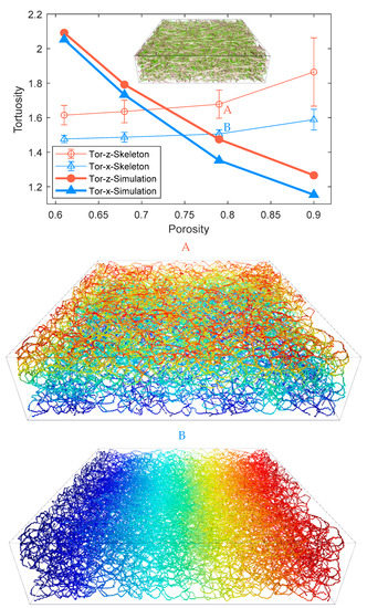 where τ is the tortuosity of the flow domain, which is commonly defined as the ratio of the length of flow path between the inlet and the outlet boundaries to the straight-line distance between these two boundaries. The tortuosity could also be geometrically interpreted by the extracted skeleton [35]. For each skeleton voxel, the shortest path along the extracted skeleton connected to the chosen inlet can be determined using the Dijkstra algorithm, yielding a distance field. The geometrical tortuosity is then measured at each voxel of the outlet surface shown as the statistical average with the deviation in Figure 8, along with transporting tortuosity, according to Equation (11). The colorful skeleton paths of the pore phase of 79% porosity PMFSS in the middle (A) and bottom (B) of Figure 8 indicate the continuous increase of pathway length from the chosen inlet surface to the outlet one. The tortuosity values range from 1.1 to 2.2 as porosity increases from 61% to 90% for both methods. The TP tortuosity is consistently higher than the IP direction for each porosity. It is attributed to the fact that the flow pathway is parallel to the material plane in the IP direction while being vertical in the TP direction. As porosity decreases, the tortuosity increases, which leads to the non-linear dependence of diffusion on the porosity, as reflected by Figure 6 and indicated by the transporting tortuosity shown in Figure 8. However, the geometrical tortuosity in Figure 8 shows an irrational trend of increase as porosity increases. Note that the transporting tortuosity is a notion suggested to reflect the comprehensive mechanism impacted by the microstructural feature, involving not only the route of the flow path but also the pore shape, the connectivity, and bottleneck effect. The number of skeleton branches is lower when porosity is higher, which reduces the chance of meeting a shorter path.