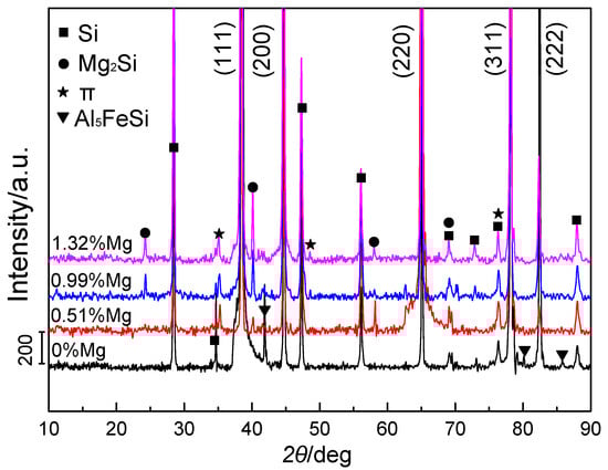 Figure 2 shows the XRD patterns of experimental alloys with various Mg additions. Three main types of alloy phases in Al-8Si alloy ingots without Mg were found: α-Al, Si, and Al5FeSi. When increasing the Mg additions, the intensity of the diffraction peak of Al5FeSi in Al-8Si-xMg alloy ingots weakened and almost disappeared at higher Mg contents (~1.32%). Moreover, additional diffraction peaks of the π phases (Al8Mg3FeSi6) and Mg2Si phases appeared in the alloy ingots and their intensity was slightly enhanced with increasing Mg contents. Therefore, it can be concluded from the XRD characterization that the predominant phase changes were from α-Al, Si, and Al5FeSi phases in Mg-free alloy to α-Al, Si, π (Al8Mg3FeSi6), and Mg2Si phases in Mg-containing Al-8Si-xMg alloy ingots.