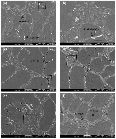 The SEM images of Al-8Si alloy and Al-8Si-(0.33–1.32)Mg alloy ingots are shown in Figure 3, and the typical EDS analysis of each alloy phase obtained from one large-enough detection point in Figure 3 are summarized in Table 2.