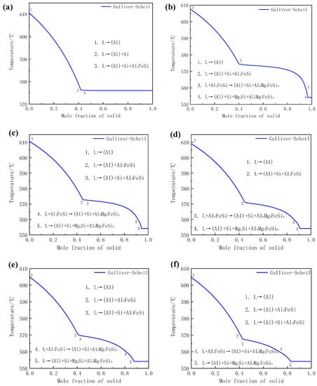 Calculated solidification curves of Al-8Si-xMg alloys under Gulliver-Scheil non-equilibrium conditions (a) without Mg and with (b) 0.33% Mg, (c) 0.51% Mg, (d) 0.78% Mg, (e) 0.99% Mg, and (f) 1.32% Mg.