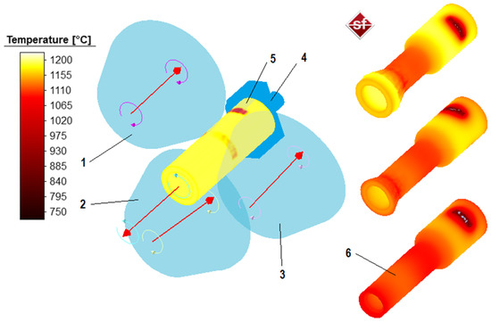 The geometrical model of the skew rolling process of the stepped shaft forming developed for the FEM analysis: 1, 2, 3—rolls, 4—gripper, 5—billet; 6—formed part and distribution of temperatures (step reduction from Ø51 to Ø30 mm, gripper velocity 20 mm/s).