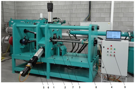 The research was based on numerical modelling using finite elements method (FEM) as well as experimental testing, performed in laboratory conditions in a numerically controlled skew rolling mill shown in Figure 4. During rolling, the billet is placed in the head of the support unit. Then, its one end is secured in the four-jaw holder of the gripper assembly. After that, the axial feed electro-screw actuator moves the billet together with the gripper assembly to the initial position. Then, the rotary movement of three tool shafts is started with tool rolls mounted on their mountings. In the next step, the three sliders start to move in radial direction, which is caused by electro-screw actuators. At the same time, the movement of the electro-screw axial slide actuator is initiated, which causes axial movement of the gripper assembly together with the rolled billet towards the axial shift actuator assembly as a result of the action of the tool rolls rotating in the same direction on the workpiece is its rotation. At the same time, the radially moving tool rolls reduce the cross-section of the formed steps. Numerically controlled skew rolling mill is characterized by a block structure and consists of nine basic units (Figure 4).