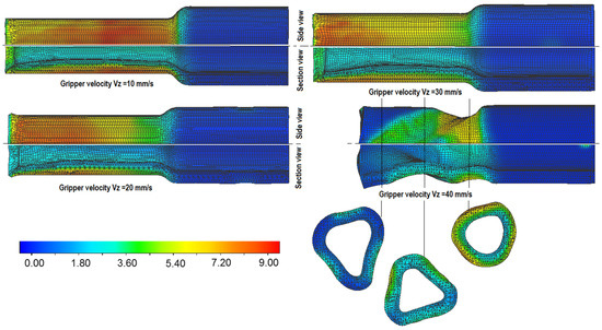The described coefficients related to the heat exchange were included in the calculations. An example of product temperature changes during rolling is given in Figure 3. The obtained values were comparable to those obtained during measurements in laboratory tests. Figure 5 shows the results of the numerical calculations for the hollow parts formed at the given values of the velocity of the gripper’s movement. In this figure the progression of the product shape in the side view and in the longitudinal section are also compared. For the case with the highest velocity of the gripper’s movement, the occurrence of process stability disturbances in the form of triangulation related to the material sliding in relation to the rolls was observed. This phenomenon is equivalent to the ovalization occurring during the rolling of products with two tools at too high values of reduction ratios or wedge forming angles in the case of cross-wedge rolling [3].