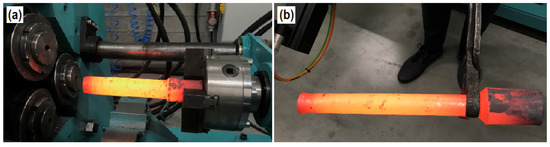 The introduction of hollow elements such as axles and stepped shafts as machine parts, in addition to reducing the weight of the structure, allows for the reduction of the moments of inertia which, for example, determine the performance of selected mechanisms equipped with them. Such activities, however, require the optimization of the shape of this type of product in terms of changes in both diameters and wall thickness along their length [3,4]. Currently, elongated axisymmetric forgings with lengths of up to several hundred millimeters are produced by cross-wedge rolling (CWR) technology [1,2] or forging longitudinal rolling (mainly blanks intended for forging) [3,4,5].