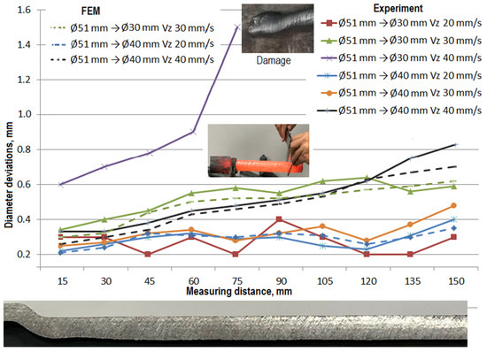 Correlating the given values with the velocity of rotation of the rolls n = 60 rotations/min results in obtaining the value of the feed rates at the level of 2 and 3 rotations per 1 millimeter of gripper displacement, respectively. In the case of formed products with the gripper movement velocities of 40 mm/s (1.5 rotations per 1 millimeter), both in numerical calculations (Figure 5) and in experimental tests (Figure 7 and Figure 8), the formed product with Ø30 mm lost wall stability and was destroyed. For the proposed value of the diameter reduction, there were significant diameter deviations (over 0.8 mm). The changes in diameter allowances (Figure 7), related to the applied process parameters shown in the figure indicated the presence of strong relationships between the feed rates, the length of the step being formed and the cross-section reduction ratios. Thus, along with the distance from the beginning of the formed step, the shape deviation values gradually increase, which is related to the increase in the free length of the product.