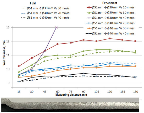 The changes in the wall thickness values presented in Figure 8 indicate their stable course along the length of the shaped step of the hollow product. However, the feed rate value is of particular importance in this case, as the obtained increases in wall thickness depend on it. With lower feed rates, the wall thickness increases, and vice versa, until the product stability is lost. This phenomenon has already been analyzed in previous studies on rotary compression and rolling extrusion processes [2,5,16], where the changing proportions of the axial and radial flow of material in these processes were analyzed. In the process of skew rolling of hollow products, this phenomenon is analogous, but the wall thinning does not occur in any of the examined cases. Reducing the feed rate speed in order to increase the wall thickness unfortunately results in a significant increase in the duration of the process.