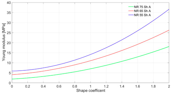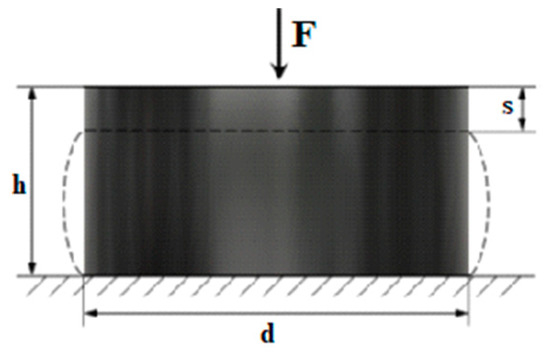 Stress relaxation occurs in loaded elastomers, i.e., the stress value at a given elongation decreases over time. Therefore, with slow stretching, lower values of corresponding stresses are obtained than with faster ones [7,20,21]. When assessing the mechanical properties, it is necessary to provide the stretching or compressing speed. Mullin and Payne dealt with these phenomena [22]. The research draws comparisons between the shock absorbers stiffness value for static and for high-velocity deflection. The deformation velocity is to be in the same order of magnitude of the deformation velocity as the UNDEX effect [1]. An example of the result of static measurements of shock absorbers stiffness made of rubber NR type is shown in Figure 6. A shape coefficient is described by Equation (29)