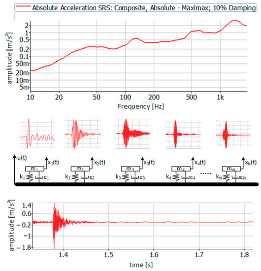 Shock Response Spectrum (SRS) is created as the sum of the responses of single systems with one degree of freedom (SDOF), all of which are subjected to the same impulse excitation [2,15,16,17]. Therefore, it is a system response presented as individual maximum accelerations (positive or negative). It should be emphasized that subsequent systems with one degree of freedom are characterized by increasing stiffness and, consequently, natural frequencies. Therefore, in the high-frequency band, the SRS spectrum obtains amplitudes close to the value of the excitation signal amplitude (transmittance close to unity) [18]. A graphic illustration of the principle of SRS spectrum creation is shown in Figure 5.