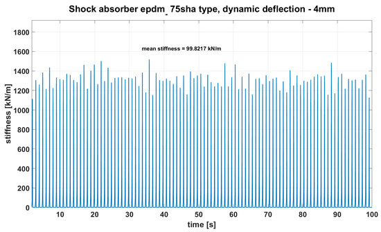 An analysis of the test results for all types indicates that with increasing speed, the stiffness for all kinds of shock absorbers increases. During the tests, it was noticed that the stiffness values for the set strain rate were not constant and that they changed significantly—see Figure 7. The average stiffness values are presented in Table 1.