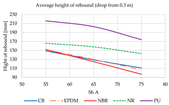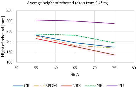 It was noticed that in all materials used in the shock absorbers, the reflection height decreased as the hardness (Sh A) increased. Described situation occurs for both heights of drop (0.3 m—Figure 8 and 0.45 m—Figure 9). This clearly shows that the dissipation of the impact energy in the case of lower material stiffness is lower (stiffness as it was presented in Table 1 is connected with the hardness of tested materials). The best result was obtained by an absorber made of NBR rubber with a hardness of 75 Sh A.