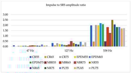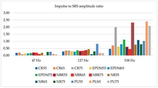 Fifteen different shock absorbers were tested, all of them having the same geometrical dimensions, i.e., cylinder diameter 20 mm with a height of 40 mm. Among them five different materials were tested (described above in the paper), each of them with three different hardness (55, 65, and 75 Sh A). All tested absorbers were dropped down from 300 and 450 mm. Due to the fact that the impulse of acceleration recorded on the hammer drop test bed was not always duplicated, selected SRS amplitudes were divided by maximum acceleration during each test. As a result, two charts were created—Figure 10 and Figure 11. Most important, three different SRS amplitudes were taken into consideration with frequencies: 47, 127, and 538 Hz.