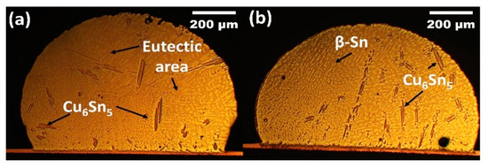 Cross-sectional as-reflowed optical microscope images for (a) non-reinforced SAC305 and (b) SAC305-KGC composite solder.