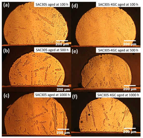 Microstructure formation at the bulk solder after isothermal ageing at 85 °C. Non-reinforced SAC305 solder at (a) 100 h, (b) 500 h, (c) 1000 h and SAC305-KGC composite solder at (d) 100 h, (e) 500 h, (f) 1000 h.