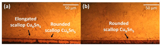 The intermetallic compound (IMC) at the interfacial was investigated based on the average thickness and morphology of IMC layer. Figure 6 shows the cross-sectional images of non-reinforced SAC305 and SAC305-KGC composite solders prior to reflow soldering process. Based on Figure 6a, the morphology of interfacial IMC layer in non-reinforced SAC305 solder had an elongated and rounded scallop of Cu6Sn5. Meanwhile, the morphology of the interfacial IMC layer in SAC-KGC composite solder had rounded scallop Cu6Sn5 and the formation of elongated scallop Cu6Sn5 was not observed. According to our previous study, the elongated scallop was formed due to the increase in concentration of Cu atoms from the substrates, diffusing and reacting with Sn, forming elongated scallop Cu6Sn5 [17]. However, in this research Cu3Sn layer was not be observed on the sample of non-reinforced SAC305 and SAC305-KGC composite solders after reflow soldering due to the significantly thinner layer. The Cu3Sn phase is known to be formed during the reaction between Sn-Cu/Cu after reflow soldering as reported by Feng et al. [25].