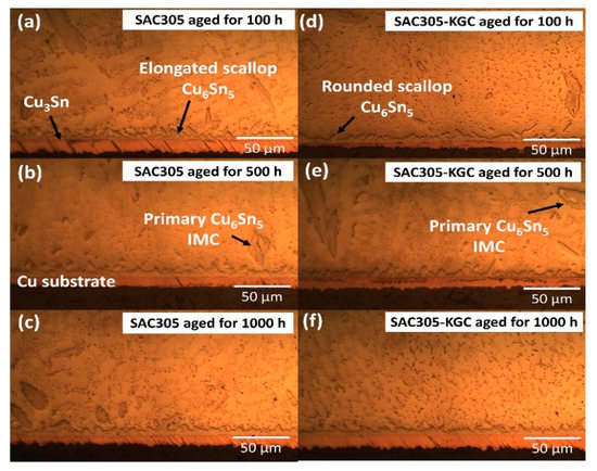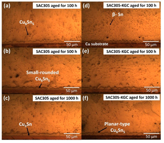 Interfacial IMC layer subjected to isothermal ageing at 150 °C. Non-reinforced SAC305 at (a) 100 h, (b) 500 h, (c) 1000 h. SAC305-KGC composite solder at (d) 100 h, (e) 500 h and (f) 1000 h.
