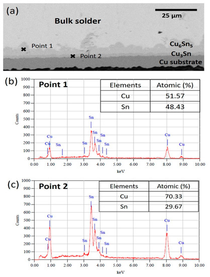 Meanwhile, Figure 7, Figure 8 and Figure 9 show the interfacial IMC layer of non-reinforced SAC305 and SAC305-KGC composite solder subjected to isothermal ageing at temperatures of 85 °C, 125 °C and 150 °C for 100 h, 500 h and 1000 h. Based on the figures, the interfacial IMC layer consists of duplex IMC structures. According to EDX analysis as in Figure 10, the duplex structure consists of light layer (Point 1) which corresponds to Cu6Sn5 IMC layer. Then, a dark layer (Point 2) was corresponding to Cu3Sn IMC layer. In addition, Figure 7 shows the interfacial IMC layer of non-reinforced SAC305 and SAC305-KGC composite solders subjected to a low isothermal ageing temperature of 85 °C for 100 h, 500 h and 1000 h. The samples showed combination of elongated and rounded scallop Cu6Sn5 with a very thin Cu3Sn IMC layer. However, as the isothermal ageing process continues with higher temperatures of 125 °C and 150 °C, the morphology of interfacial IMC layer in non-reinforced SAC305 was formed with some elongated and small rounded scallop as depicted in Figure 8a–c and Figure 9a–c. Meanwhile, in SAC305-KGC composite solder, the interfacial IMC layer grew towards more planar-type morphology with increasing ageing time and temperature as shown in Figure 9d–f.