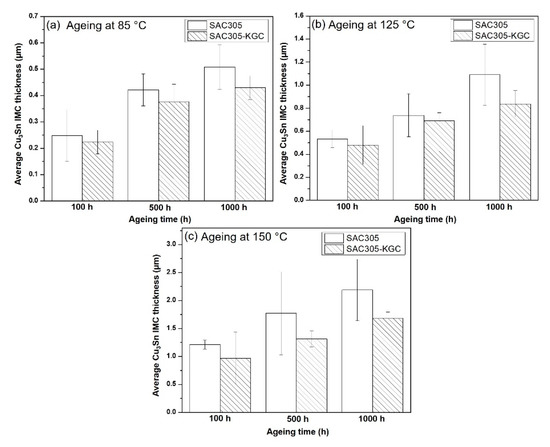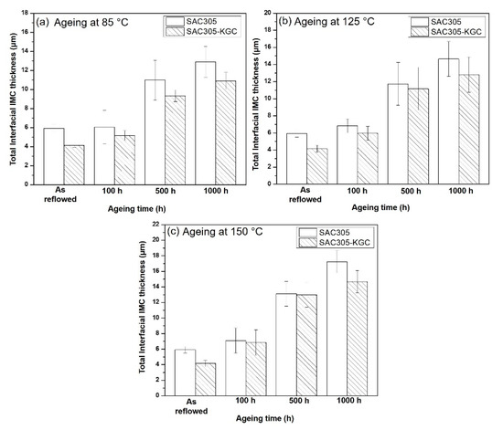 To precisely elucidate the growth of interfacial IMC layer on non-reinforced SAC305 and SAC305-KGC composite solders during isothermal ageing, the average thickness of interfacial IMC layer was calculated by using ImageJ software Figure 11 illustrates the bar graph showing the total (Cu6Sn5 + Cu3Sn) average of interfacial IMC thickness subjected to different isothermal ageing temperatures and time. Based on the figure, it can be seen clearly that the total interfacial IMC thickness increased in non-reinforced SAC305 and SAC305-KGC composite solders as the temperature and time increased. However, the total interfacial IMC thickness of non-reinforced SAC305 was higher compared to SAC305-KGC composite solder. Figure 11c illustrates, that the total interfacial IMC thickness of non-reinforced SAC305 at isothermal ageing of 150 °C/1000 h was ~17 µm. Meanwhile, the total interfacial IMC thickness for SAC305-KGC composite solder under the same condition was ~14 µm. Therefore, this result suggests that the incorporation of KGC particles in SAC3055 solder is beneficial in suppressing the interfacial IMC thickness during solid state ageing with the suppression of approximately 15%.