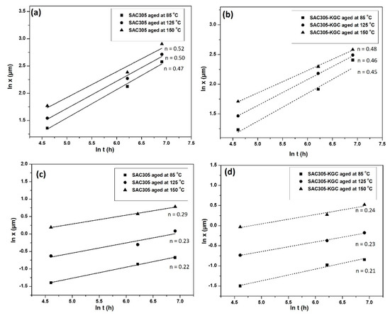 Time exponent of Cu6Sn5 for (a) non-reinforced SAC305, (b) SAC305-KGC composite solder. Cu3Sn, (c) non-reinforced SAC305 and (d) SAC305-KGC composite solder.