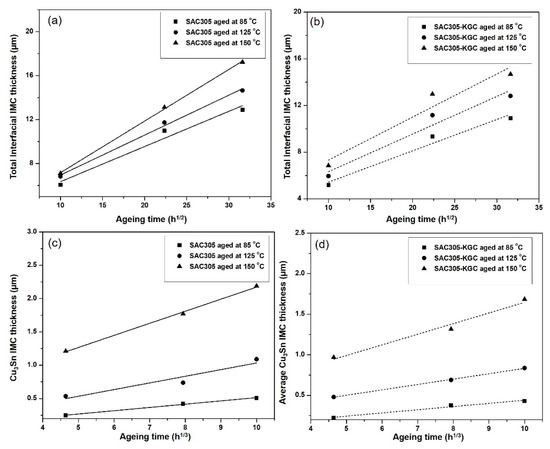 Moreover, Figure 14 presents the relationship between total interfacial IMC thickness layer (including Cu6Sn5 and Cu3Sn) and Cu3Sn IMC with several ageing temperatures and times for non-reinforced SAC305 and SAC305-KGC composite solders. Based on the graph plotted in Figure 14, the total interfacial IMC thickness layer and Cu3Sn IMC increased with an increase ageing time and grew faster at higher ageing temperature. Interestingly, the thickness of IMC layer was suppressed with the incorporation of KGC during the solid-state ageing. Quantitative investigation on the effect of KGC particles towards the interfacial thickness of IMC layer, across non-reinforced SAC305 and SAC305-KGC composite solders during the solid-state ageing, can be described according to Equation (1). The diffusion coefficient D can be determined from a linear regression analysis by plotting the graph presented in Figure 14, where the slope of the graph is equal to D. Thus, the diffusion coefficient, D for the growth of total interfacial IMC layer and Cu3Sn IMC in non-reinforced SAC and SAC305-KGC composite solders are presented in Table 1. Based on the values of diffusion coefficient obtained, SAC305-KGC composite solder showed lower D value compared to SAC solder at all ageing temperatures. This can be inferred that, KGC particles could hinder the growth of IMC between the solder and substrate. Additionally, at a temperature of 150 °C with ageing time of 1000 h, the values of D for both solders increased corresponding to the thicker IMC at the interfacial layer. This owes to the fact that higher ageing temperature can provide appropriate thermal energy in order to overcome the higher activation energy of diffusion elements [27]. The results obtained was parallel with the studied done by Yin et al. [33].