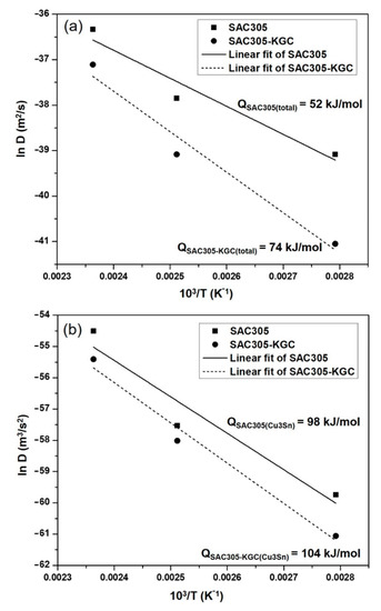 Arrhenius plot of ln D vs. 1/T for (a) total interfacial IMC layer and (b) Cu3Sn layer in SAC305 and SAC305-KGC composite solder.