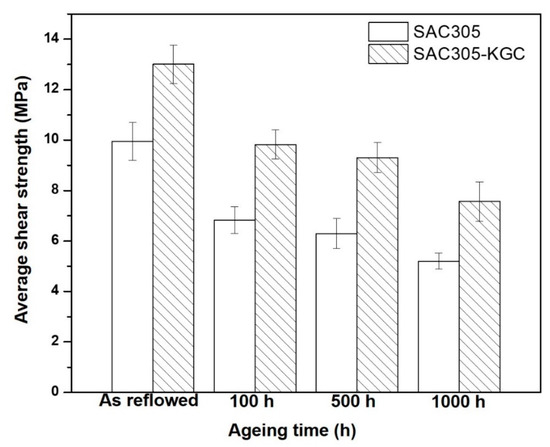 Figure 16 depicts the results on average shear strength of non-reinforced SAC305 and SAC305-KGC composite solders prior to reflow soldering and subjected to isothermal ageing of 150 °C at 100 h, 500 h and 1000 h. The average shear strength of non-reinforced SAC305 and SAC305-KGC composite solders after reflow soldering were ~10 MPa and ~13 MPa, respectively. The average shear strength of SAC305-KGC composite solder showed 31% improvement compared to non-reinforced SAC305 after reflow soldering process. However, during the isothermal ageing treatment at higher temperature of 150 °C for 100 h, 500 h and 1000 h, the average shear strength for non-reinforced SAC305 and SAC305-KGC composite solders displayed declining trend. The average shear strength decreased with the increase in temperature and longer ageing time. Nevertheless, the average shear strength of SAC305-KGC composite solder was still higher across all the samples aged at different time and temperature as compared to non-reinforced SAC305 solders. The lowest average shear strength was shown by non-reinforced SAC305 solder aged at 150 °C for 1000 h, which is about ~5 MPa. It was expected that, at higher ageing time and temperature, the shear strength is poor. This can be associated with the increment in the total thickness of interfacial IMC layer as depicted in Figure 11. The decreasing trend of the average shear strength across all the samples were corresponding to the thickness of the IMC layer. The thicker the IMC layer, the lower the average shear strength. This is because, IMC is brittle. Thus, thicker IMC layers were easily exposed to brittle failure and consequently, reducing the strength of solder joints. Nevertheless, the average shear strength in SAC305-KGC composite solder was still higher than non-reinforced SAC305 solders. This suggests that KGC particles play an important role in improving the shear strength during ageing process. In addition to this, KGC particles are also believed to be able to pin the dislocation motions and hinder the grain-boundary sliding across the solder matrix. The results obtained was in good agreement with the study done by Chen et al. [8]. He reported that the improvement in the shear strength of Sn-3.0Ag-0.5Cu during solid-state ageing was attributed to the theory of dispersion strengthening resulting from the addition of reinforcement particles.