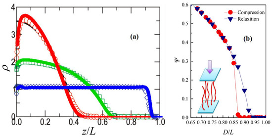 (a) The single chain mean-field theory (SCMFT) results (lines) were compared with the results from self-consistent field theory (SCFT) (scatters), which were from the reference. These results were computed with the same chain flexibility but different grafting densities (red), (green) and (blue). (b) The inset shows the scheme diagram of compression of the nematic brushes. A tilting transition takes places when the nematic brushes are subjected to the external compression. A hysteresis loop of the tilting transition during the compression and relaxation process indicates that this is a first-order transition. Reprinted with permission from ref. [6]. Copyright 2015 AIP Publishing.