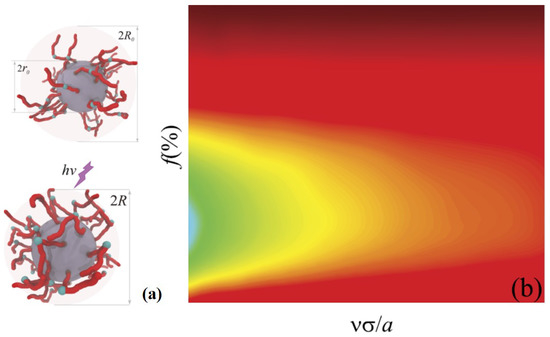 Taking the advantages of SCMFT, the properties of the azo polymer brushes can be well described. As an example, a light-responsive spherical nanoparticle grafted with azo polymer brushes was studied theoretically. As the result of the UV light induced trans-cis isomer switching of the azo group, such a core-shell nanoparticle was subjected to contraction in terms of its overall size upon UV light irradiation [32], as shown in Figure 2a. The assembly of these smart nanoparticles set a playground to study phase transitions, including sol-gel [33] and glass transition [34], because the volume fraction of particles, which triggers these phase transitions, can be conveniently manipulated by light. Immersing these nanoparticles in a liquid crystal solution, photoswitching of the azo polymer configuration can orient the surrounding liquid crystal molecules, leading to different types of topological defects around the nanoparticle [35]. The performance of this mechanism can be characterized by the brush height ratio between before and after UV irradiation, . It is determined by the competition of length scales of the tail and the whole chain and can be optimized using the relative position of an azo bond along the chain f. The partial chain with and are called the tail and spacer, respectively. A large f, i.e., a long spacer, ensures that the orientation of the tail cannot be affected by the substrate. A small f, i.e., a long tail, means a large chain can be operated. Moreover, both intrinsic properties of polymer brushes, grafting density and chain flexibility, affect the performance. A brush without UV requires high grafted density and flexibility of the chain to extend the chains. Upon UV irradiation, the brush must be sufficiently loose to hide the brush tail and the chain must be sufficiently rigid such that the tail can be controlled by the azo bond. Figure 2b demonstrates the dependence of on both f and grafting density of the semiflexible chain condition as an example. There is an optimized f for any given grafting density.