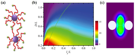 (a) Scheme diagram of the interaction between two spherical particles coated with a reactive end polymer. (b) The reaction parameter as the function of D and . (c) The overlapping region of polymer ends from two particles in the semiflexible chain condition. Reprinted with permission from ref. [37]. Copyright 2017 Wiley-VCH Verlag GmbH & Co. KGaA, Weinheim, Germany.