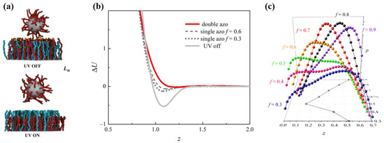 By virtue of the light-driven mechanism of an azo polymer, an optical reactive adhesion smart surface can be designed as shown in Figure 4a. The spherical nanoparticle is grafted by polymer, which is considered the adsorbate. The end groups of polymer are ligands. The smart surface modified by a hybrid grafted layer is considered the adsorbent, which consists of homopolymers and active polymers with receptors as the end groups. An azo bond is introduced into the active polymer chain of the hybrid polymer brush. Without UV illustration, the receptors are distributed around the outer part of the brush layer and can easily interact with the ligands, which allows the nanoparticle to be adsorbed at the surface. Oppositely, upon UV, the reactive polymers are folded such that the receptors are hidden into the hybrid layer. As a result, an effective interaction between the nanoparticle and the smart surface is decreased, and thus, the nanoparticle is erased from the surface [38]. The performance and mechanism of this azo-polymer-based smart surface were investigated using SCMFT [39]. The adhesion/erasion transition of the system shows that the performance of the smart surface can be characterized by the interaction potential difference between the effective nanoparticle–surface interactions in the UV-on and UV-off states shown in Figure 4b. A critical factor that affects the performance of the smart surface is again the position of the azo-bond along the backbone, f, which directly determines the relative length of the tail and the spacer. Upon UV-on, the zo-bond takes the cis-isomer, which makes the tail fold back. However, to erase the nanoparticle efficiently in the UV-on state, the receptors should be embedded as deeply as possible. The effect of f on the distribution of the receptor groups in this condition is shown in Figure 4c. The peak of the distribution function first approaches the substrate as f decreases and then move away from the substrate for . Indeed, the curves of in Figure 4a have typical bimodal characteristics, and thus, each of these distribution curves can be regarded as the superposition of two subtle modes, which is crucial for optimizing the position of the azo-bond along the azo-polymer f.