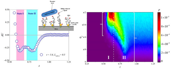 A sliding polymer brush is constructed by adding sliding anchors to the polymer chains, through which the polymer chains can slide with self-regulating lengths. The two ends of the polymer chains are modified by ligands to prevent polymer escape from the anchoring point [40]. The sliding degree of freedom regulates the polymer configuration of the brush and increases the available reaction range, which markedly changes the kinetics and effective interaction potential of the specific binding pairs. This brush introduces a new degree of freedom to the polymer chain, i.e., the repetitive move of the chain through the sliding anchor. It is hard to solve the propagator of the chain in SCFT with the constraint of a sliding anchor. Moreover, the translational degree of freedom of the nanoparticle and the interaction between chain ends and the anisotropic nanoparticle are difficult to formulate in an SCFT model. In SCMFT, these difficulties can be overcome by introducing the corresponding Monte Carlo trial move during sampling. The adhesion of an anisotropic nanoparticle on the sliding brushes was studied using SCMFT [41]. A novel bistable adhesion behavior composed by an energy dominated state (state I) and an entropy dominated state (state II) was found as shown in Figure 5a. This behavior was from the cooperation between the repetitive motion of the sliding polymer and rotational degree of freedom of the spherocylinder. The role of the orientational entropy was quantified by analyzing the distribution of the tilting angle of the spherocylinder, which is shown in Figure 5b. For state I, the orientation angle is around , which indicates that the orientational motion of the particle are largely constrained and lies on the substrate. For state II, the orientation direction is distributed in a wide range of . Therefore, state II is an orientational entropy dominated state. This system can be used to create a smart surface with a wide sensitive range for bacteria adhesion and a biosensor for experiments and provide a possible explanation for the bistable adhesion behavior of the bacteria on the surface, mediated by type IV pili.