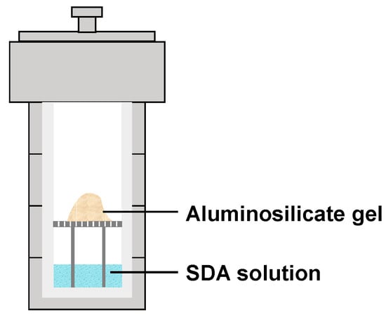 In response to a series of problems caused by the excessive usage of water in the synthesis of zeolite, dry-gel conversion (DGC) and vapor-phase transport (VPT) techniques were developed [20]. The dry-gel sample was placed above the structure-directing agent (SDA) solution and reacted with water and amine vapors at a sealed autoclave under elevated temperature and autogenous pressure (Figure 1) [17,21]. ZSM-5 was successfully synthesized at 180–200 °C for 5–7 days. The mixed solution of water and amine was separated from the solid phase, which facilitated the recovery of the solution and could be reused to avoid wastewater treatment. Moreover, the cost of organic amines occupied a large part of the synthesis of zeolite, which reduced the consequent cost of the product.