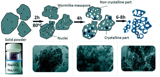 Zeng et al. [42] synthesized hierarchically porous SOD zeolites by the solvent-free method with organosilane as a mesopore-generating agent. Figure 2 illuminated the schematic process of the growth mechanism for hierarchically porous SOD via the solvent-free method. Before crystallization after grinding, the samples formed an amorphous solid. After crystallization for 2 h, worm-like mesoporous channels resulting from amorphous aggregates could be observed. After crystallization for 4 h, voids or cavities were detected, which would result in the formation of cell-like SOD zeolite. The synthesized SOD zeolites exhibited small mesopores (4.6 nm) owing to organosilane surfactant and meso-macropores (20–55 nm) attributed to interparticle voids.