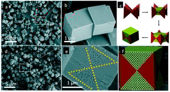 SEM images of SAPO-34 (a,b) before and (d,e) after solid oxalic acid treatment, (c) schematic drawing of the growth of SAPO-34, and (f) the drawing of the morphology of treated SAPO-34. Reproduced from Ref. [46] with permission from The Royal Society of Chemistry.