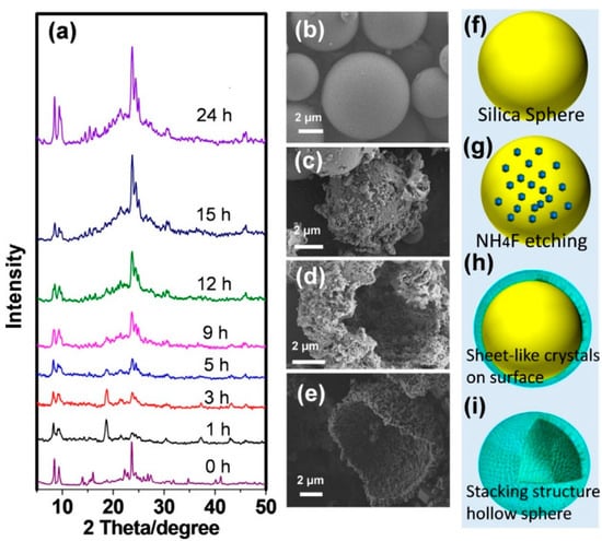 Wu et al. [51] synthesized a hollow zeolite shell assembled by ZSM-5 with a short b-axis by the solvent-free method. SiO2 spheres were used as silica source, with prefabricated ZSM-5 and NH4F as Al source and mineralizer, respectively. In-situ XRD analysis and SEM were performed to analyze the morphological and structural evolutions. After crystallizing for 1 h, the peaks of MFI significantly weakened, indicating that prefabricated ZSM-5 was broken down into small segments. Meanwhile, the peak at 18.68° was associated with (NH4)2SiF6, inferring that NH4F reacted with silica from the substrate and prefabricated ZSM-5 which roughen the surface of the silica ball (Figure 4b,c). No (NH4)3AlF6 peaks appeared in all samples, indicating that the confined Al source prevented coordination between Al and the fluoride species giving a well-preserved acidic framework Al in the final products. After crystallizing for 2–4 h, SiF62− species were gradually condensed to Si(OSi)4 in the initial stage of MFI crystallization (Figure 4d). As the crystallization was prolonged, SiF62− species were completely converted into ZSM-5 (Figure 4e). During crystallization, silica was migrated to the surface leading to the formation of the hollow structure.
