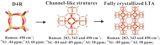 The crystallization process of the ground mixture was demonstrated by NaA zeolite [60]. The result of UV-Raman characterization demonstrated that after 24 h of aging at room temperature, the ground sample showed a weak band at 498 cm−1, which was related to the four-membered rings (4R). It was consistent with the peak position of the sample after crystallization at 80 °C for 2 h. However, the as-ground sample did not exhibit the same band. This indicated that the raw materials could interact with each other at room temperature after grinding, and spontaneously form a four-membered rings (4R) structure. With the increase in crystallization time, in addition to 4R, six-membered rings (6R) and eight-membered rings (8R) appeared, and the intensities of these signals increased. The results of 27Al MAS NMR, 29Si NMR and 27Al 2D MQMAS NMR further showed that 4R in the parent mixture were double four-membered rings (D4R) rather than a single four-membered ring (S4R). After 4 h of crystallization, all D4R units had been converted into LTA structure. It can be concluded that hydrated silica and sodium aluminate would interact with each other spontaneously, leading to the formation of D4R, which could be further assembled or rearranged into NaA crystals in the absence of water solvent, as shown in Figure 6.