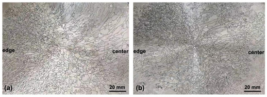 Grain morphology and distribution in the top slice of Air- (a) and He-cooled (b) ingots of NbTi alloy.