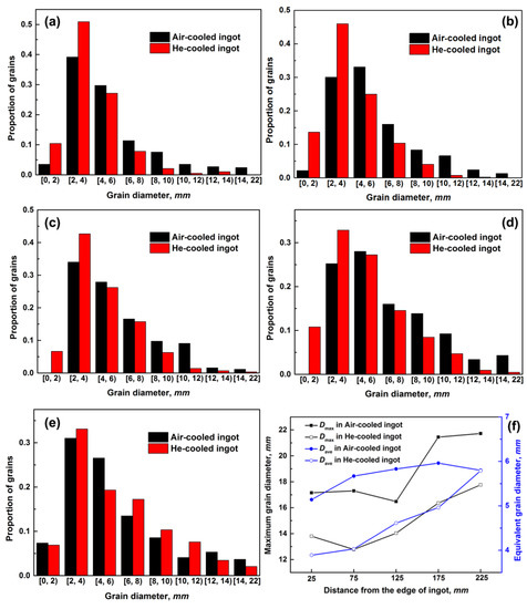 The final grain morphology and size are revealed in Figure 3. After He cooling, grains become more equiaxed and their dimension is also smaller. The difference of the oriental grain-size distribution from edge to center of the ingot is compared in Figure 4. In both ingots, the grain sizes are mainly distributed from 2 mm to 8 mm (Figure 4a–e). With the increase in distance from the ingot edge, the grain size becomes larger. At the edge of the air-cooled ingot, the maximum (Dmax) and average (Dave) grain sizes are 17.15 mm and 5.14 mm, respectively, and they increase to 21.72 mm and 5.8 mm in the center, respectively. As a comparison, grain size shifts toward the left direction in the He-cooled ingot, indicating the increasing number of small grains. The proportions of the small grains (<5 mm) are 66% and 72%, respectively, in air- and He- cooled ingots. Specially, the ultra-large grains obviously decrease in the He-cooled ingot, and Dmax in the edge and center are lowered to 13.8 mm and 17.16 mm, respectively.